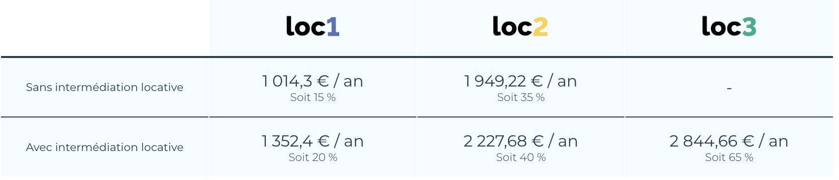 - l’accès au niveau de loyer le plus bas, réservé exclusivement à l’intermédiation locative, avec une réduction fiscale pouvant atteindre 65 % des revenus locatifs.
